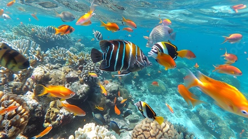 Fototapeta premium Vibrant coral reef teeming with diverse marine life and colorful corals in crystal clear waters