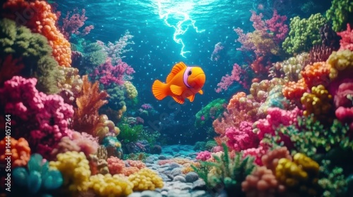Naklejka premium Vibrant coral reef teeming with life under a powerful underwater lightning...