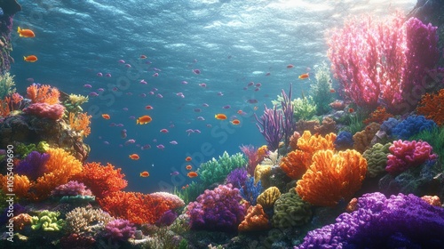 Obraz premium Vibrant coral reef teeming with life under a sunlit surface.