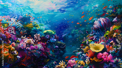 Naklejka premium Vibrant Coral Reef Teeming with Marine Life