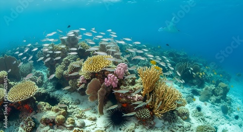 Naklejka premium Vibrant coral reef teeming with small fish in a clear, shallow ocean.