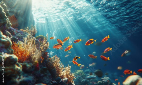 Fototapeta premium Vibrant coral reef teeming with tropical fish and illuminated by sunlight filtering through crystal-clear blue water