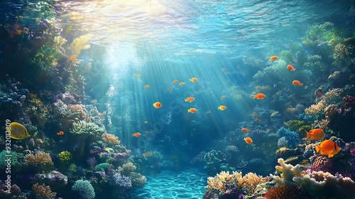 © Thawatchai, Fototapeta premium Vibrant Coral Reef Teeming with Tropical Fish in Sunlit Azure Waters
