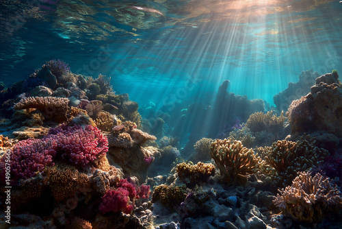 Fototapeta premium Vibrant Coral Reef Undersea Scene with Sunlight Rays