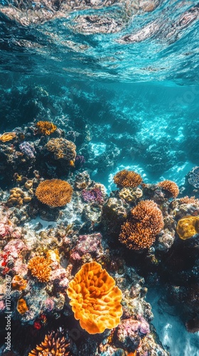 Naklejka premium Vibrant Coral Reef Underwater Ecosystem Scene