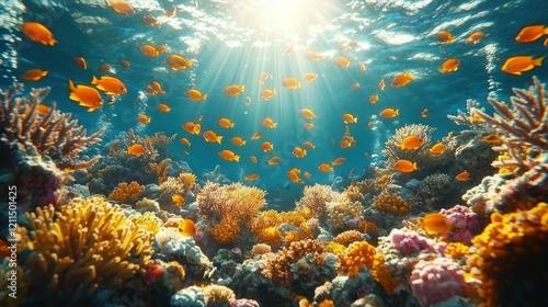 Fototapeta premium Vibrant Coral Reef Underwater Paradise: A Sunlit Ocean Scene