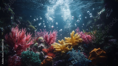 Naklejka premium Vibrant coral reef underwater scene, bubbles rising, sunlit surface, aquarium...