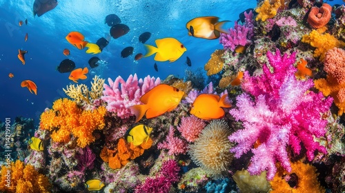 Naklejka premium Vibrant Coral Reef Underwater Scene Featuring Colorful Fish Species
