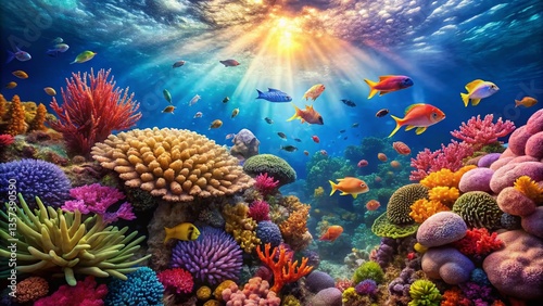 Fototapeta premium Vibrant Coral Reef Underwater Scene, Great Barrier Reef Australia Stock Photo