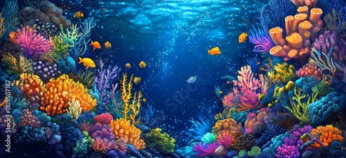 Naklejka premium Vibrant Coral Reef Underwater Scene Ocean Life Tropical Fish Bioluminescent...