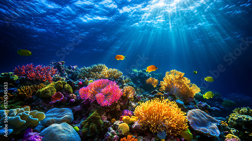 Fototapeta premium Vibrant Coral Reef Underwater Scene with Colorful Fish