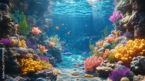 Naklejka premium Vibrant Coral Reef Underwater Scene with Colorful Fish and Clear Water