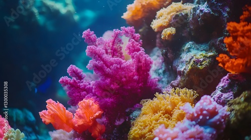 Fototapeta premium Vibrant Coral Reef Underwater Scene with Colorful Soft Corals in Ultra HD...