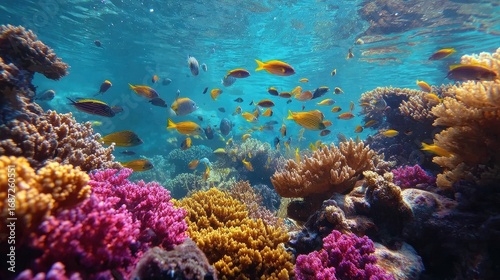 Fototapeta premium Vibrant Coral Reef Underwater Scene with Colorful Tropical Fish