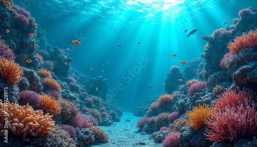 Naklejka premium Vibrant Coral Reef Underwater Scene with Fish
