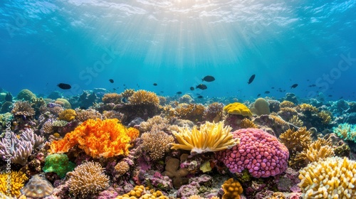Obraz premium Vibrant Coral Reef Underwater Scene with Sunlight Rays and Fish