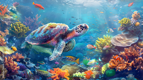 Obraz premium Vibrant coral reef with a sea turtle grazing on colorful algae, surrounded by...