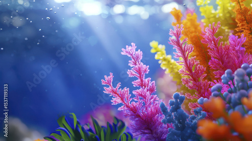 Fototapeta premium Vibrant coral reef with colorful corals underwater scene marine life ocean sunlight aquatic plants blue water biodiversity