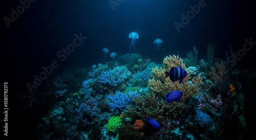 Fototapeta premium Vibrant Coral Reef with Colorful Fish and Glowing Jellyfish