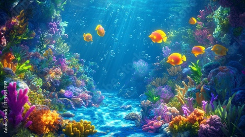 © Monchisa, Fototapeta premium Vibrant Coral Reef with Colorful Fish and Sunlight Beams Underwater