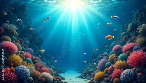 © Victor, Naklejka premium Vibrant coral reef with colorful fish illuminated by sunlight