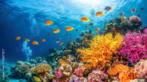 Naklejka premium Vibrant Coral Reef with Colorful Fish in Clear Blue Waters