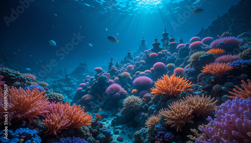 © abida, Fototapeta premium Vibrant Coral Reef with Exotic Marine Life in Blue Ocean