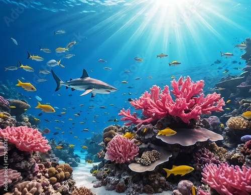 Naklejka premium Vibrant Coral Reef with Grey Reef Shark and Colorful Fish