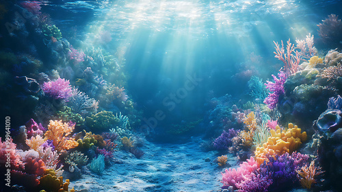 Obraz premium Vibrant coral reef with sunbeams shining through the water.