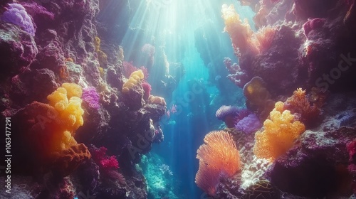 Naklejka premium Vibrant Coral Reef with Sunlight Beams