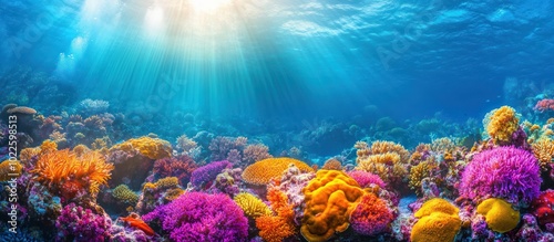 Naklejka premium Vibrant coral reef with sunlight shining through the clear blue water.