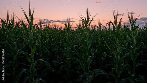 © GMeta, Fototapeta premium Vibrant cornfield at dusk with towering stalks long shadows and a colorful sky Perfect for agricultural and nature concepts