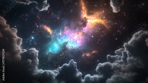 Fototapeta premium Vibrant Cosmic Canvas, an expansive view of a star-filled sky adorned with colorful nebula clouds in the depths of space