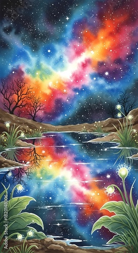 © Runti, Obraz premium Vibrant Cosmic Galaxy Reflected in Serene Water Landscape.