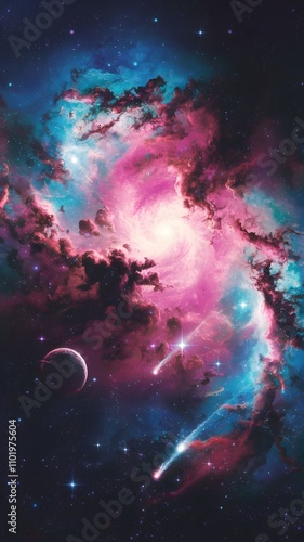 Fototapeta premium Vibrant cosmic galaxy swirls and nebula with surreal starry hues, space art