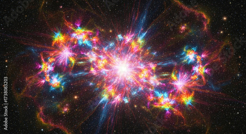 Naklejka premium Vibrant cosmic nebula explodes with dazzling rainbow colors against a starry...