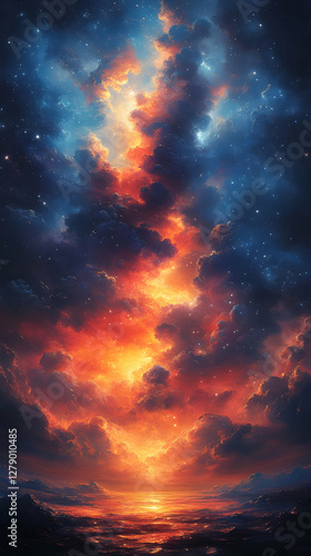 Fototapeta premium Vibrant Cosmic Sky Featuring Starry Nebulae Orange Hues With Deep Blue Galaxy...