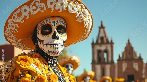 Obraz premium Vibrant Costumed Performers Taking Part in the Annual La Calaca Festival to Celebrate the Day of the Dead in the Historic Town of San Miguel de Allende Mexico