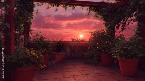 © Thares2020, Obraz premium Vibrant crimson sunset paints the sky over a serene rooftop terrace adorned with lush potted plants climbing vines and a rustic wooden pergola