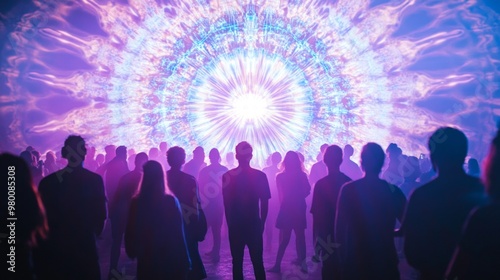 Obraz premium Vibrant Crowd Celebrating at a Kaleidoscopic Light Sculpture During an...