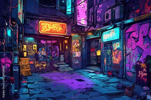 Fototapeta premium Vibrant cyberpunk alley with graffiti and neon lights at night