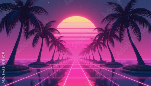 © Crazy Stock – Studio, Naklejka premium Vibrant Cyberpunk Sunset Landscape 3D Wallpaper Retro Futurism Nostaia. A neonlit tropical beach with palm trees and a sunset.