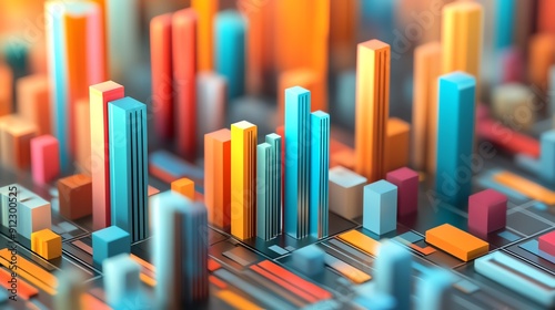 © AKE, Obraz premium Vibrant 3D illustration of colorful data visualization with rising bars and abstract shapes, ideal for technology and analytics themes.