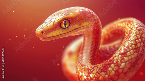© Keopaserth, Fototapeta premium vibrant 3D illustration of snake with glossy, textured skin in shades of orange and red, set against warm gradient background. snake eye is striking and captivating, adding to its charm