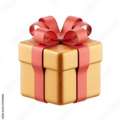 © Laki, Obraz premium Vibrant 3D rendering of a matte gold gift box with a red ribbon
