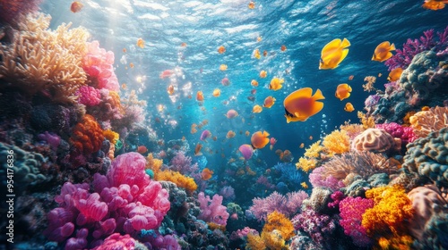 © fourtakig, Naklejka premium Vibrant 3D Underwater Coral Reef Scene with Playful Sea Creatures and Bubbles