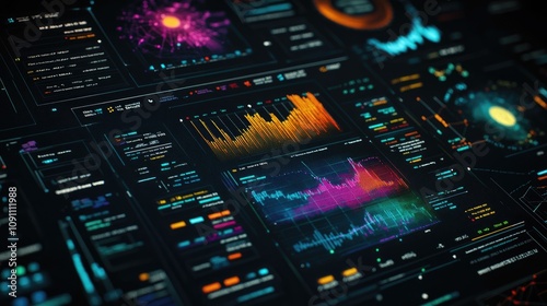 Obraz premium Vibrant Data Visualization and Analytics Dashboard with Colorful Graphs, Statistical Charts, and Interactive Elements for Insights and Business Intelligence