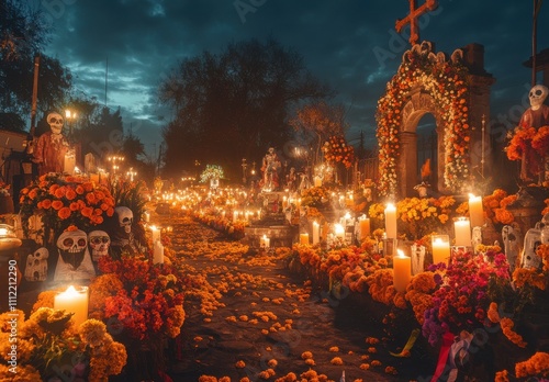 © ANUAR, Obraz premium Vibrant Day of the Dead Celebration with Colorful Altars, Skulls, and Marigolds Illuminated by Candles Under a Gloomy Sky