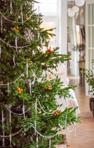 © Maksim Shebeko, Fototapeta premium Vibrant decorations and glittering icicles create a festive atmosphere in the cozy room
