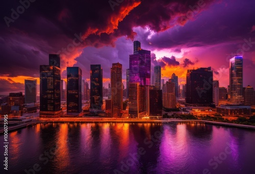 © Yaroslava, Fototapeta premium vibrant depictions dynamic weather urban landscapes featuring stormy radiant reflections city skylines, architecture, cityscape, light, shadow, pavement